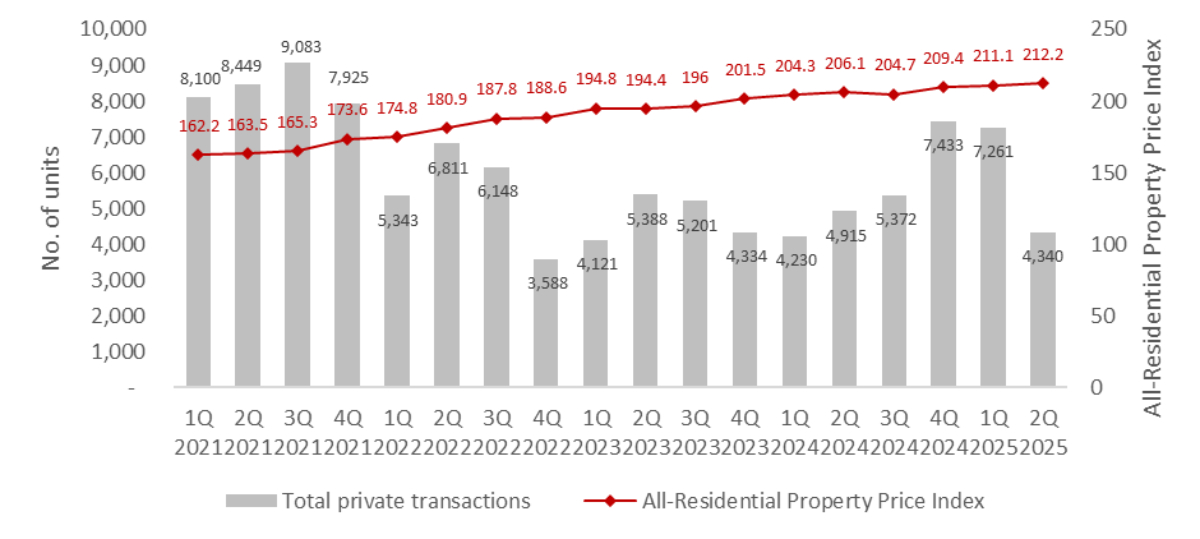 According to URA’s flash estimates, the All-Residential Property Price Index exhibited a modest increase of 0.5% quarter-on-quarter (q-o-q) in 2Q 2025, while the total transaction volume of private homes dipped 40.2% q-o-q to 4,340 units.