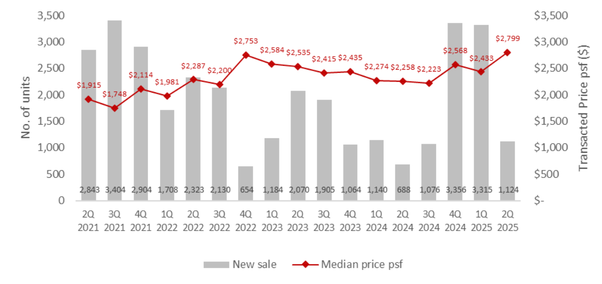 New sale transactions saw a sharper decline in 2Q 2025, primarily due to a fewer and smaller-scale new home launches. This includes, 21 Anderson (19 units), Bloomsbury Residences (358 units), One Marina Gardens (937 units) and Arina East Residences (107 units). Some launches were held back due to May’s election period and the June school holidays.