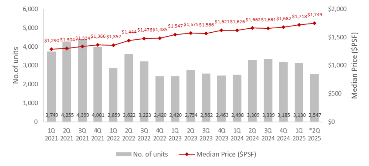 Amid fewer completions, prices in the resale market grew once more in 2Q 2025. A slight 1.8% q-o-q uptick was registered as median unit prices rose from $1,718 psf in 1Q 2025 to $1,749 psf to 2Q 2025.