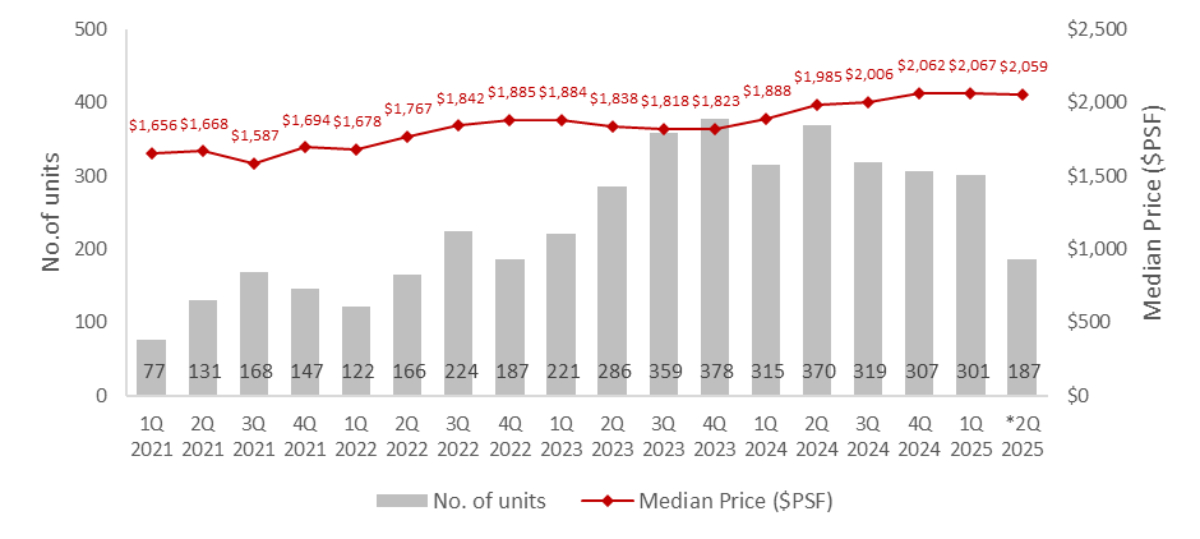 Median unit prices for sub-sale transactions also edged down, slipping 0.4% from $2,067 psf in 1Q 2025 to $2,059 psf in 2Q 2025. However, this modest dip is likely a temporary fluctuation, as 2Q 2025’s median unit price remains well above the past five-quarter average of $2,002 psf recorded from 1Q 2024 to 1Q 2025.