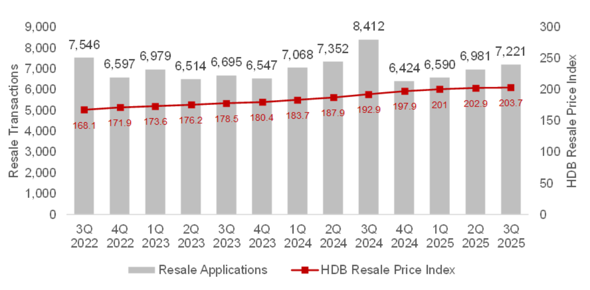 In 3Q 2025, a total of 7,221 HDB resale transactions were recorded, representing a marginal 1.7% increase from the previous quarter and an 11.3% decline compared to the same period last year.