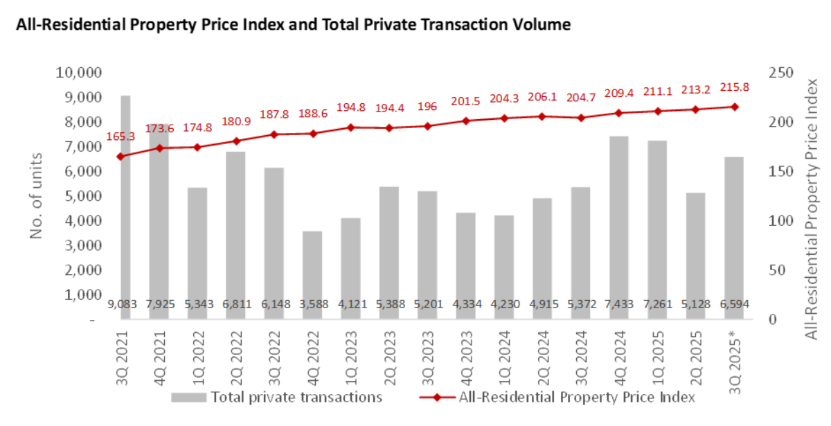 SINGAPORE, 1 October 2025 – According to flash estimates released by the Urban Redevelopment Authority (URA) for 3Q 2025, the All-Residential Property Price Index exhibited a modest increase of 1.2% quarter-on-quarter (q-o-q), while the total transaction volume of private homes rose 28.6% q-o-q to 6,594 units.