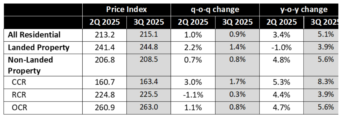 “Among the market segments, non-landed homes in the Core Central Region (CCR) recorded the fastest pace of growth at 1.7% q-o-q in 3Q 2025.”