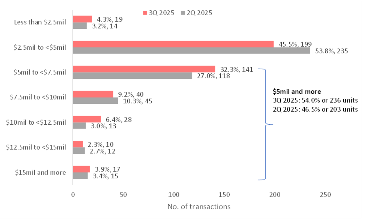 “Similar to last quarter, the majority (67.3%) of new non-landed private home sales were concentrated in the sweet spot range of $2.5 million or less. However, a notable 30.9% of transactions were also in the $2.5 million to $5.0 million range, a result of the high price points of CCR new launches.”