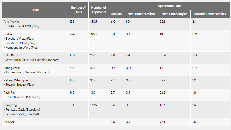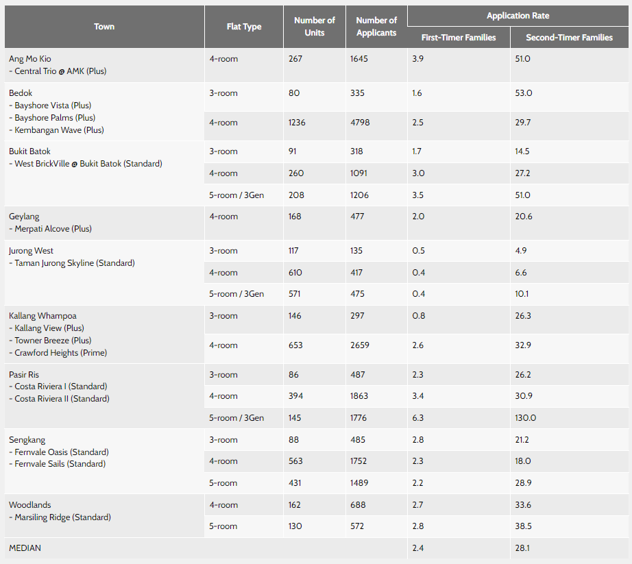 Other Standard projects at Sengkang (Fernvale Oasis and Fernvale Sails) and Woodlands (Marsiling Ridge) too witnessed fairly robust responses across the board for 3-room and larger units, with first-timer family application rates ranging from 2.2 – 2.8 and 2.7 – 2.8 times respectively.