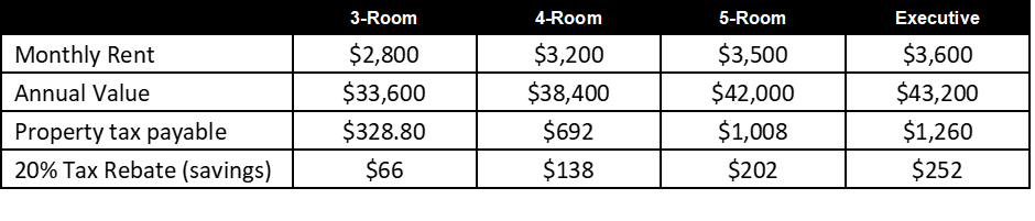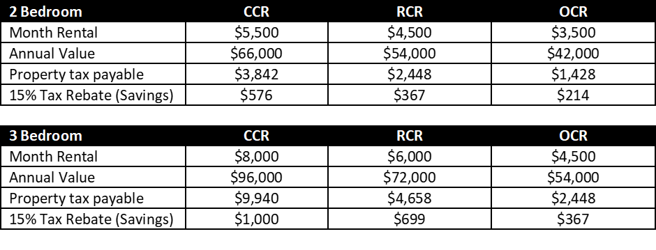 But not all private property owners will benefit from the full 15% tax rebate due to the $1,000 cap. For example, a homeowner of a 3-bedroom unit in CCR with a property tax liability of $9,940. Instead of receiving a 15% tax rebate that amounts to $1,491, they will only be entitled to $1,000.