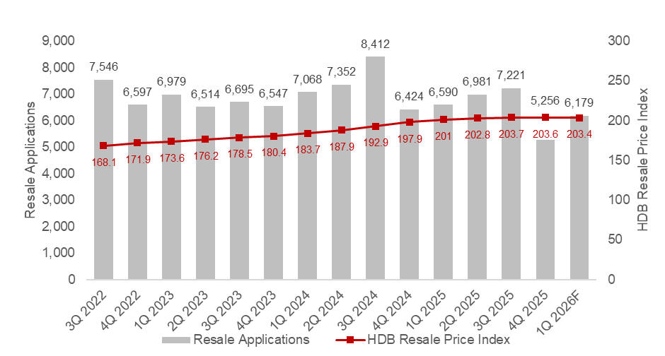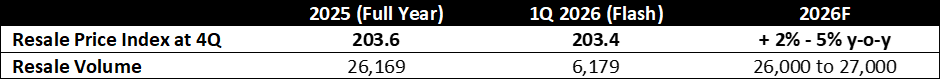 In 1Q 2026, the HDB Resale Price Index (RPI) moderated 0.1% quarter-on-quarter (q-o-q) to 203.4, down from 4Q 2025’s figure of 203.6. Simultaneously, a total of 6,179 resale transactions were registered over the quarter, representing an 17.6% q-o-q increase over the 5,256 cases recorded in 4Q 2025.