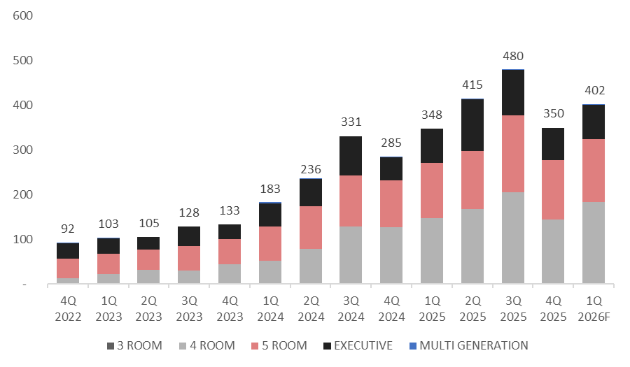 With 13,480 HDB flats fulfilling their MOP in 2026, this puts pipeline supply for the HDB resale market at its highest since 2023. Moreover, this figure represents a significant 93.3% year-on-year (y-o-y) increase from the 6,973 units recorded for 2025.