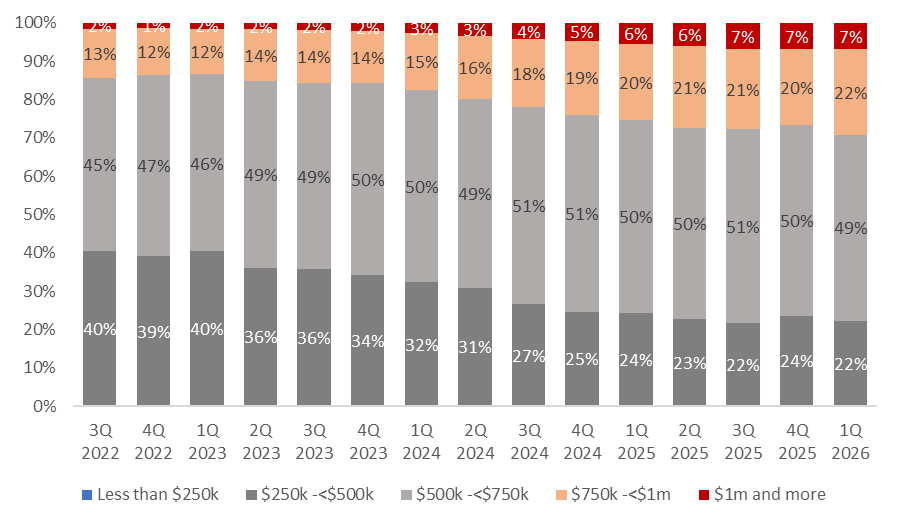 Nonetheless, the HDB resale market remains affordable, with the majority of transactions (70.8%) taking place below the $750,000 mark in the quarter. Additionally, million-dollar flat sales made up only 6.9% of all transactions observed in 1Q 2026.