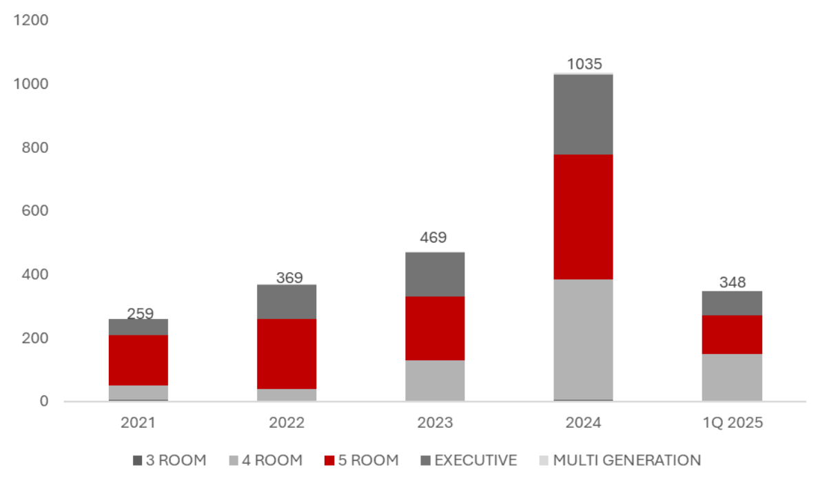 与2024年第四季相比,2025年首季三房式和四房式组屋交易量有所上升加,而公寓式组屋单位(Executive flat)的交易量则继续下滑。