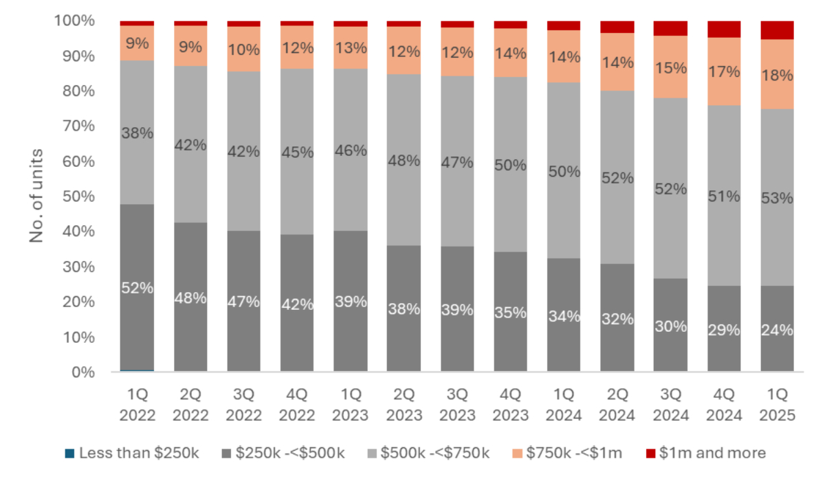 2025年第一季度,百万组屋交易占所有交易的8.9%,几乎是2024年第四季的两倍,当时为4.6%。