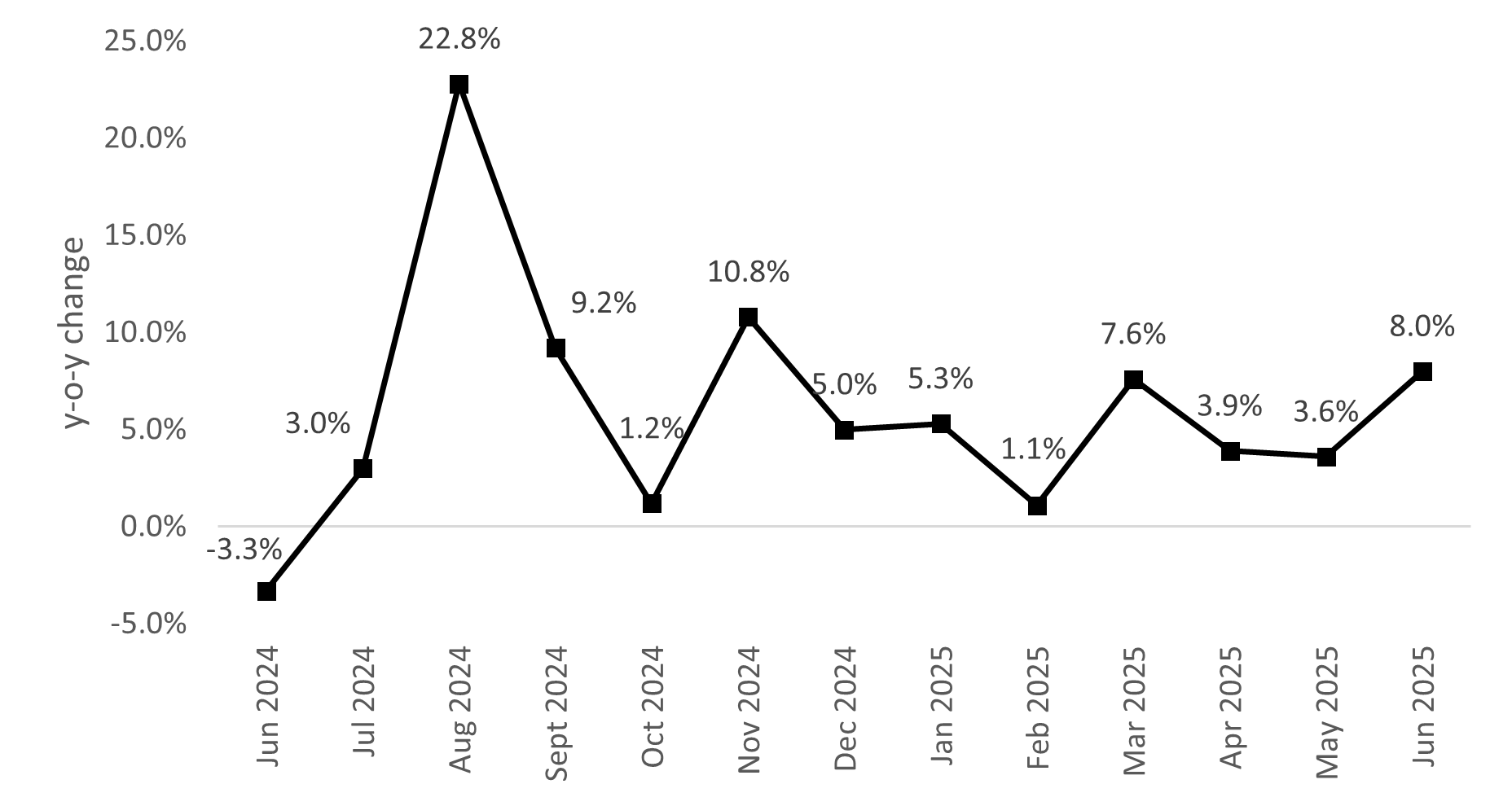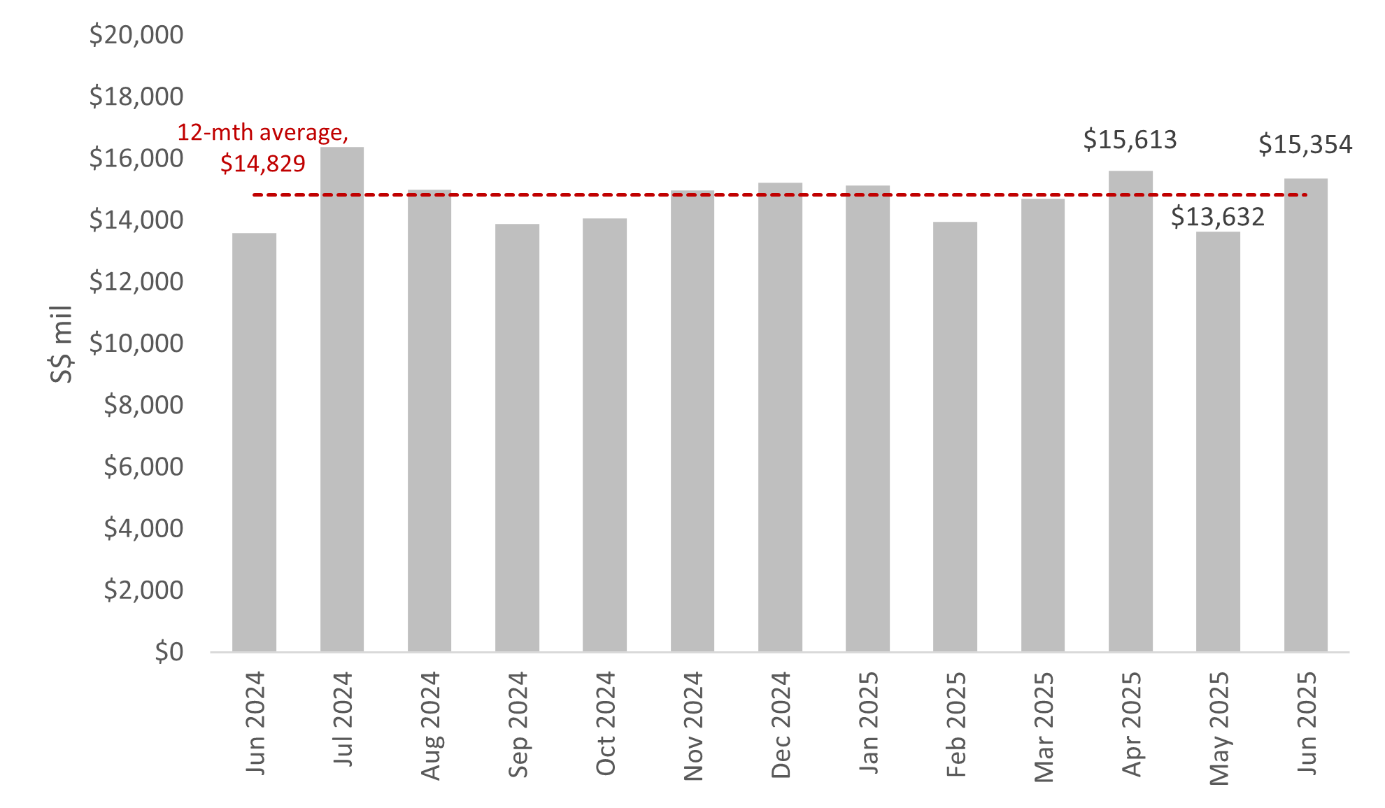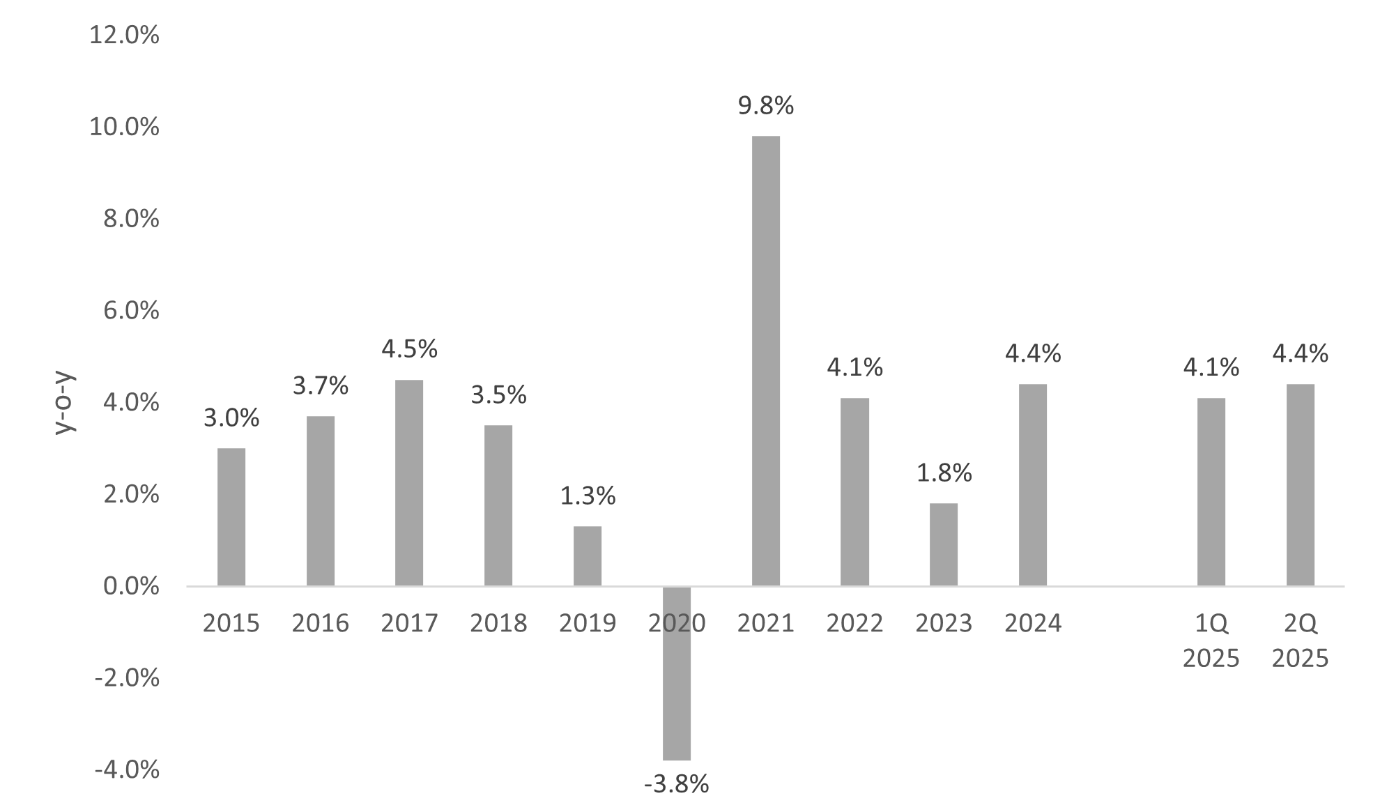 Singapore’s economy expanded 4.4% year-on-year (y-o-y) in 2Q 2025 reflecting better-than-expected economic growth in 1H 2025. In line with this, the Ministry of Trade and Industry (MTI) had upgraded Singapore’s GDP growth forecast from “0.0% to 2.0%” to “1.5% to 2.5%” for the whole of 2025. Nonetheless, the persistent global uncertainty is likely to cap Singapore’s economic outlook for 2H 2025.