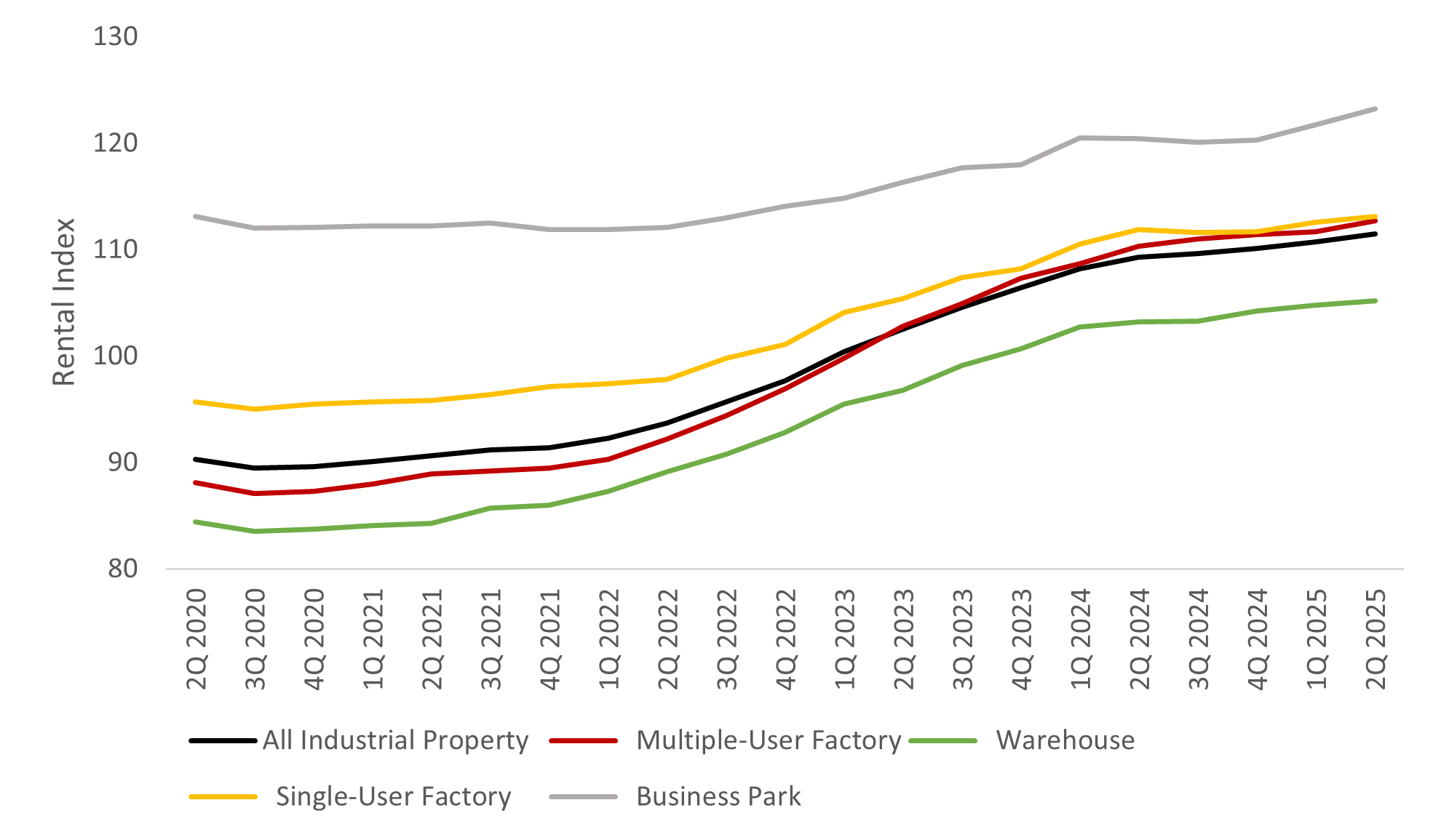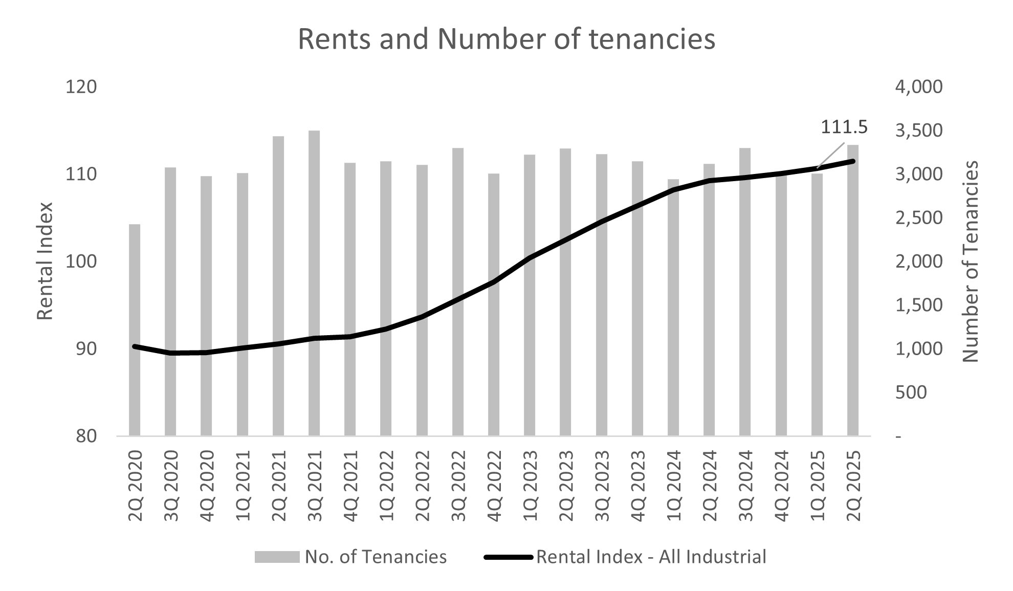 The JTC All Industrial rental index continued its upward trend, rising for the nineteenth consecutive quarter in 2Q 2025. Rents grew by a further 0.7% q-o-q, extending the 0.5% growth seen in the previous two quarters.