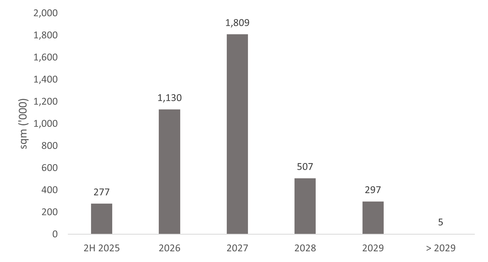 In the 2H 2025, another 13 new industrial developments are slated for completion, injecting 277,000 sqm of industrial space into the market. Some notable developments include a warehouse space at Toh Guan Road East (50,920 sqm), Bulim Square by JTC Corporation (74,780 sqm) and a Single-user industrial development at Pasir Ris Industrial Drive 1 (37,520 sqm).