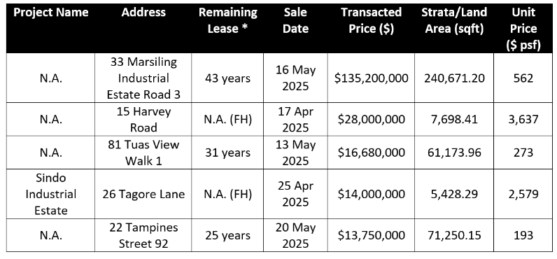 The top transaction in 2Q 2025 was the sale of 33 Marsiling Industrial Estate Road 3 for $135.2 million. It was part of Mapletree Industrial Trust’s divestment strategy to Brookfield Asset Management, where three assets were collectively sold for $535.2 million. The other assets include the neighbouring 35 Marsiling Estate Road 3 and The Strategy and The Synergy, both at International Business Park. However, their caveats were not lodged.