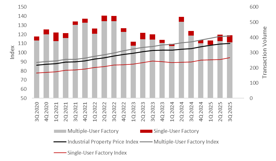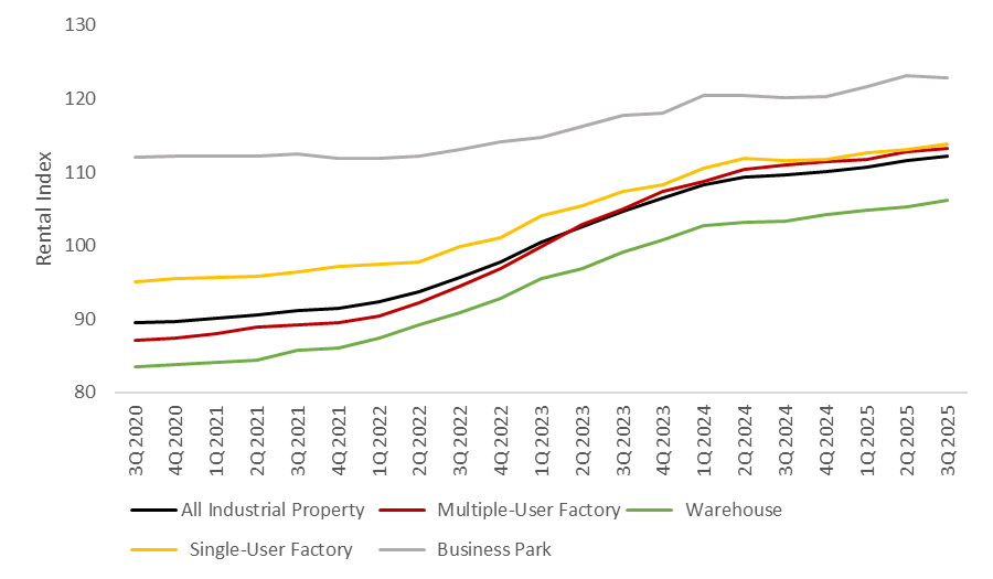 Overall, the Industrial Property Price Index increased by 0.6% quarter-on-quarter in 3Q 2025 to 110.3. This increase was modest compared to the 1.4% rise seen in 2Q 2025. Nevertheless, it marked the sixth consecutive quarter of rising prices, with the index now at an all-time high.