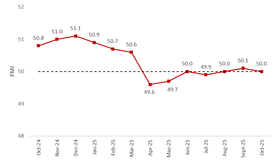 *The PMI reading with a score above 50 indicates that the manufacturing economy is generally expanding, and that the economy is generally declining when the reading falls below 50, and a score of 50 indicates no change from the previous month.