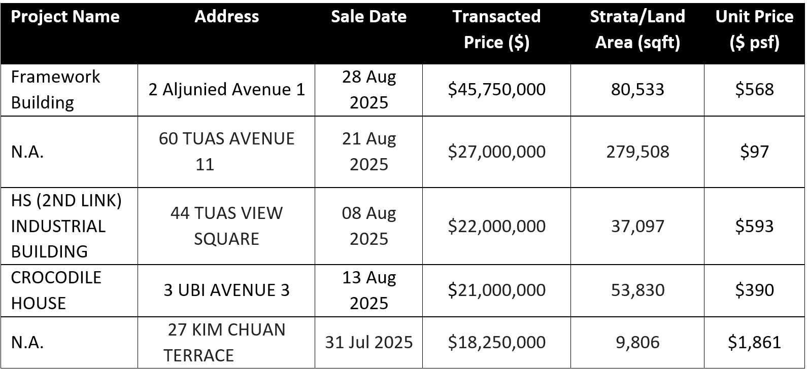 The largest deal in 3Q 2025 involved CapitaLand Ascendas REIT (CLAR) divesting five properties in August 2025 for a total of $329 million, reportedly to a consortium led by EZA Hill. This highest-value transaction was the sale of a five-storey ramp-up logistics property for $140 million. Other properties included 10 Toh Guan Road (The Furniture Mall, $84.5 million), 9 Changi South Street 3 ($51.5 million), and 31 Ubi Road 1 ($30 million). Three of these properties are logistics facilities, demonstrating investors' confidence in the sector.