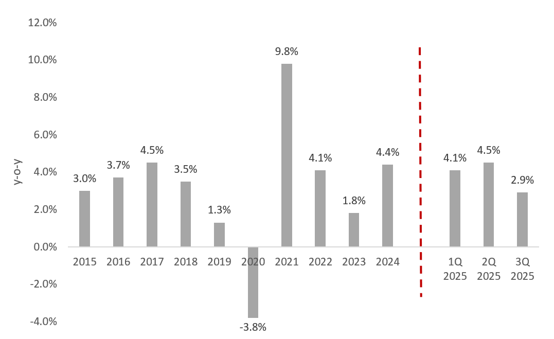 Singapore’s economy grew by 2.9% year-on-year (y-o-y) in the third quarter of 2025, surpassing earlier forecasts of 2% growth amid US tariffs. The Ministry of Trade and Industry (MTI) had earlier upgraded Singapore’s GDP growth forecast from “0.0% to 2.0%” to “1.5% to 2.5%” for the entire year of 2025 in August.