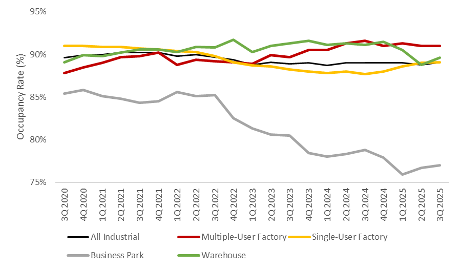 Occupancies across the industrial market remained stable in 3Q 2025, rising slightly to 89.1%, up from 88.8% in the previous quarter. This reflects healthy absorption supported by steady take-up of the new supply completed during the period. The ongoing supply pipeline has helped ease vacancy pressures amid broader global economic uncertainties.