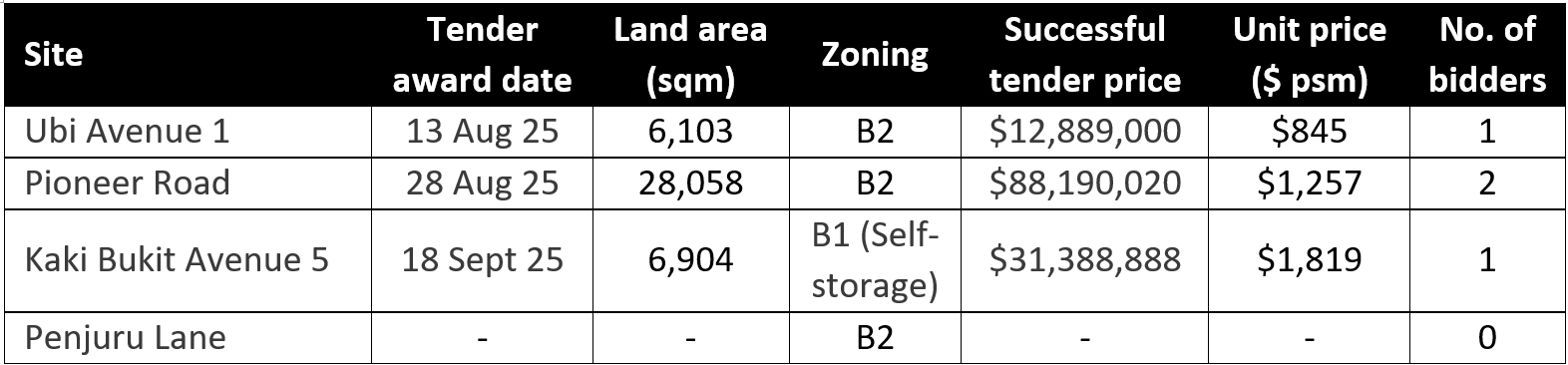In the Industrial Government Land Sales (IGLS) sector, JTC awarded three industrial sites in 3Q 2025, while one site attracted no bidders.