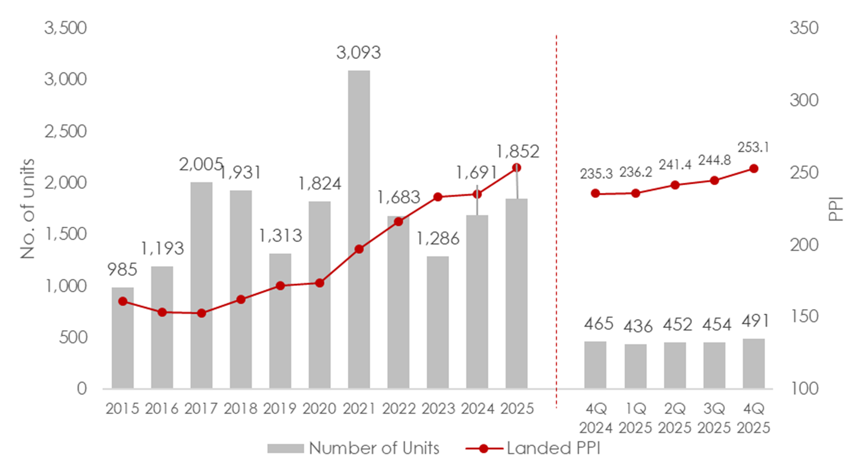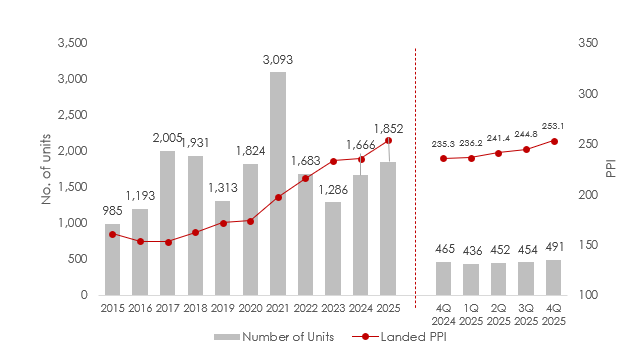 Based on URA caveats, landed home transactions rose 4.0% q-o-q to 491 transactions in 4Q 2025. It also marked the quarter with the highest number of landed home transactions since 2Q 2022. This brings 2025’s total to 1,852 transactions, 11.2% more than the whole of 2024.