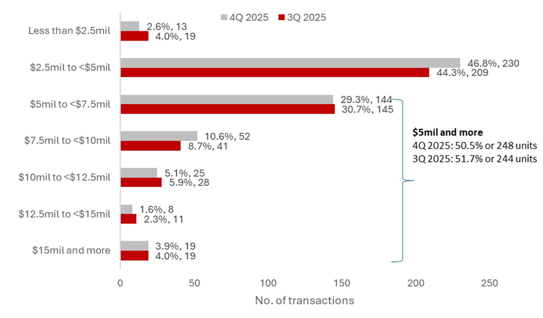 Overall, 4Q 2025 saw more landed homes sold at a higher price quantum compared to 3Q 2025, affirming the rising landed prices. About half (50.5%) or 248 units of the landed homes transacted in 4Q 2025 were priced above $5 million, similar to the 51.5% or 244 units in 3Q 2025. In terms of proportion, the price range of landed home transactions remained largely similar.
