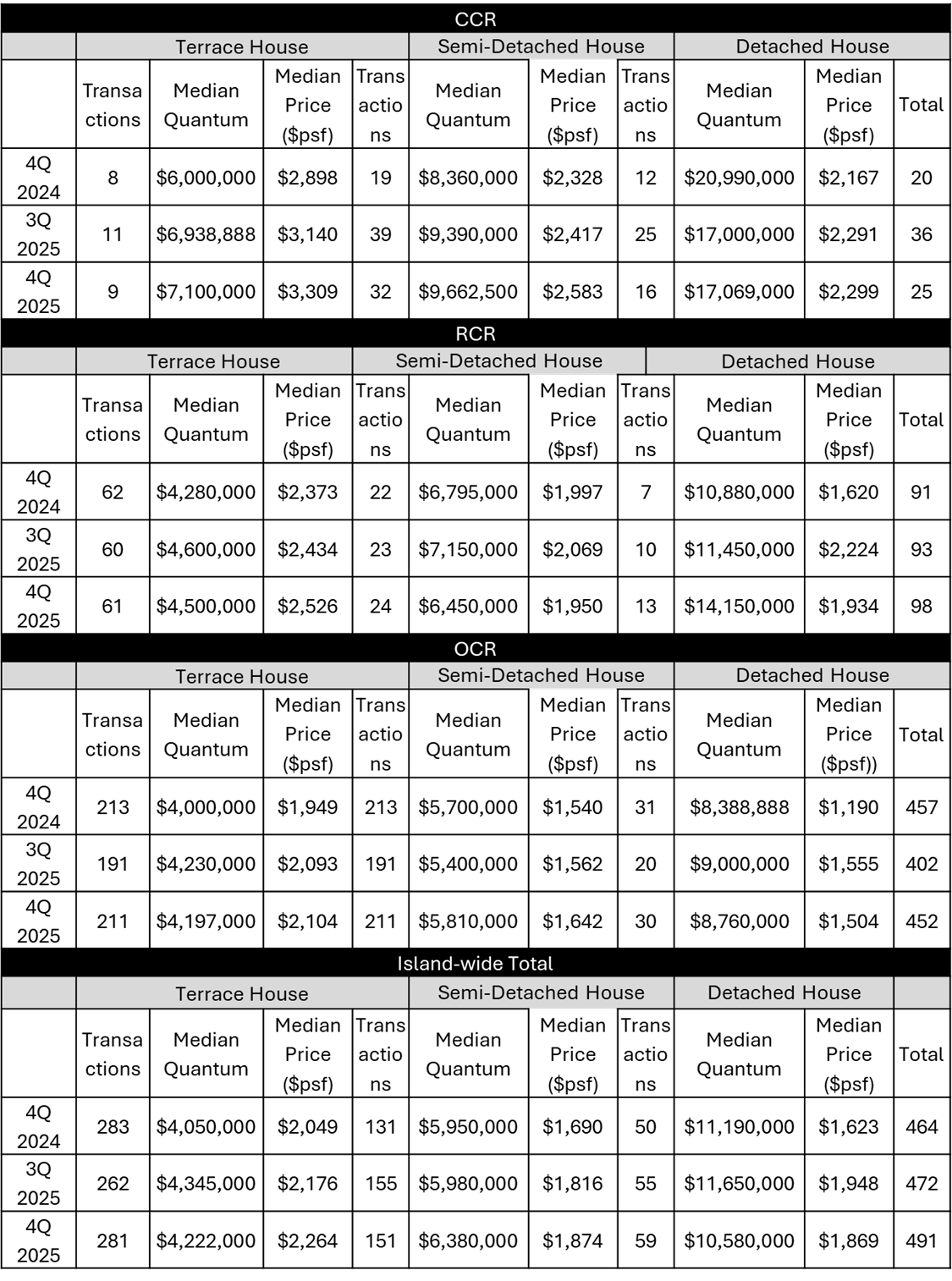 However, the CCR landed home market saw a 30.6% q-o-q decline to 25 transactions in 4Q 2025. This comes as the median price psf and median quantum of homes transacted have risen, reflecting renewed demand for prime landed properties. Such homes are viewed as stable assets that offer long term appreciation due to their finite supply and prestigious status. Moreover, CCR landed home sellers, typically with higher holding power, are less inclined to reducing their prices. Thus, buyers and sellers faced an impasse on prices.