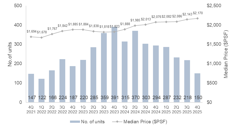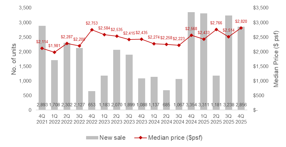 According to caveats as of 29 December 2025, new sale transactions saw a decline of 12.6% q-o-q to 2,856 units in 4Q 2025. This steep decline came on the back of fewer launches, with five developments launched compared to nine in 3Q 2025. Despite the decline, 4Q 2025 sales performance was still exceptional, carrying the strong sales momentum from the previous quarter.
