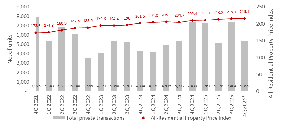 According to flash estimates released by the Urban Redevelopment Authority (URA) for 4Q 2025, the All-Residential Property Price Index rose modestly by 0.7% quarter-on-quarter (q-o-q). Based on caveat data as of 29 December 2025, total transaction volume of private homes decreased by 27.1% q-o-q to 5,399 transactions from 7,404 transactions registered in 3Q 2025.
