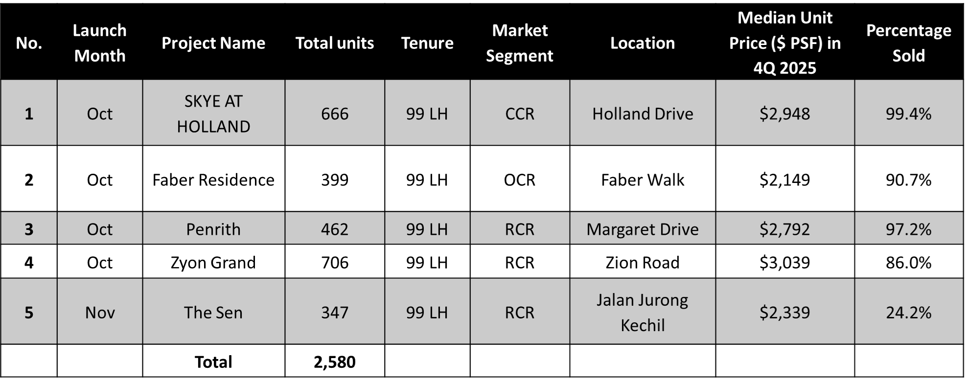 Four of the five new launches in 4Q 2025 were in the Central Region (CCR and RCR). This followed the trend of the previous quarter when four CCR and three RCR developments were launched.