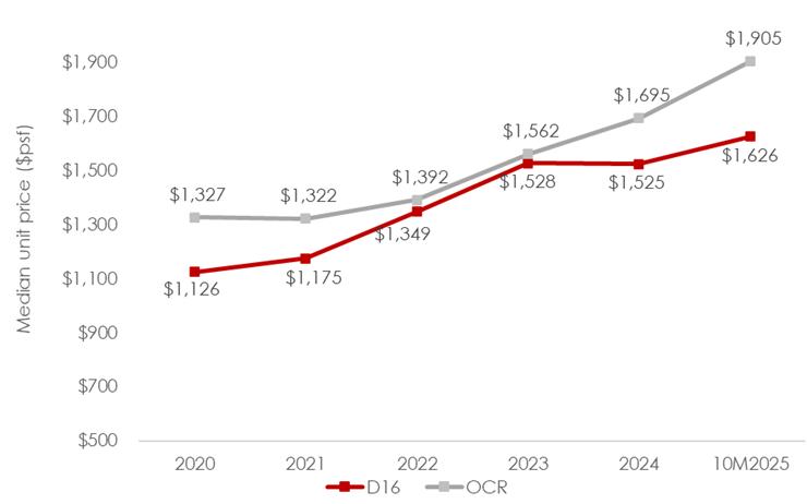 While D16’s price movement was generally positive, its trajectory was not entirely linear with a sharp rise in 2023 and prices held relatively flat in 2024 before gaining momentum again in 2025. The overall pattern underscores D16’s resilience and long-term appeal, particularly as the area continues to benefit from new infrastructure enhancements and upcoming MRT expansion.