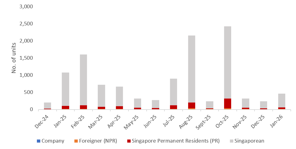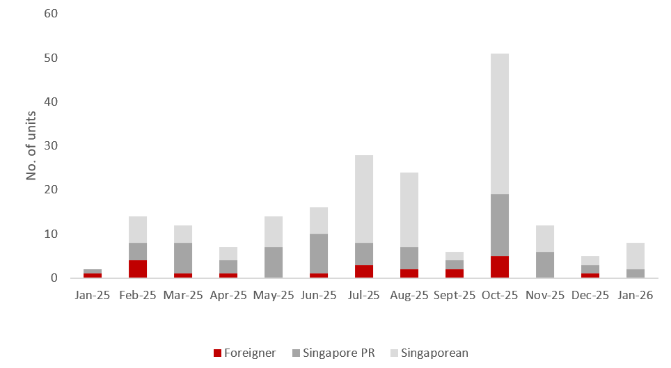 With the steep Additional Buyer’s Stamp Duty still in place, demand from foreign buyers for new private homes remained subdued. In January, foreign buyers completed only nine non-landed private home transactions (excluding ECs), accounting for a meagre 1.9% of the month’s total deals. Meanwhile, Singapore Permanent Resident buyers purchased 51 new non-landed private homes, accounting for 11.0% of all new private home (excluding ECs) purchases in the month.