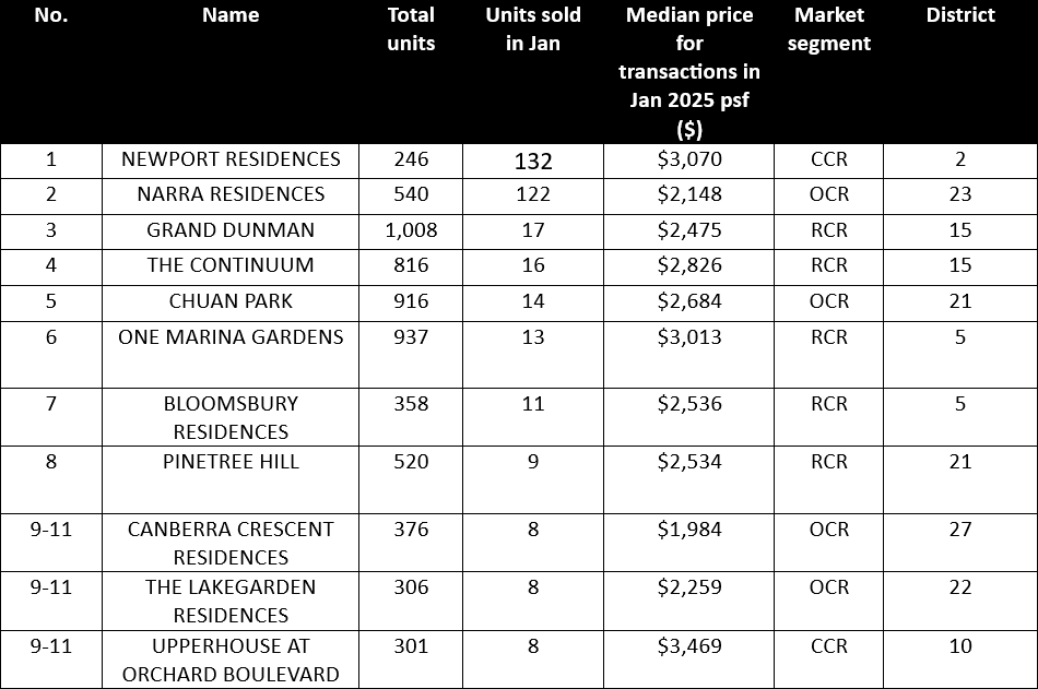 Table 2: Top-performing new non-landed projects (excluding ECs) in January