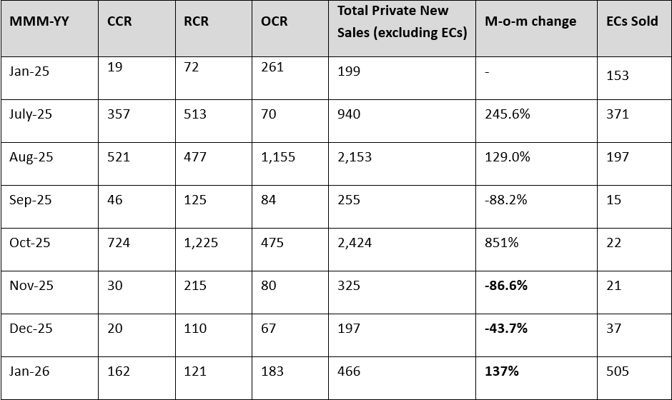 January 2026’s monthly developer sales report recorded 466 new private homes (excluding ECs), reflecting a 137% month-on-month (m-o-m) increase in transaction volume.