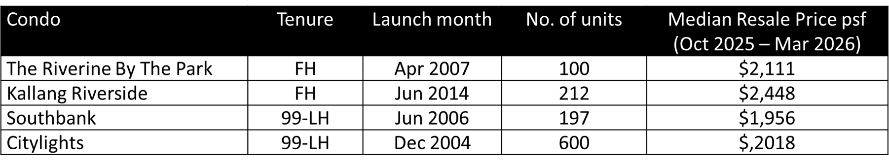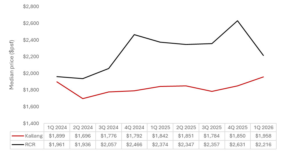 The median price per square foot (psf) for non-landed homes in Kallang Planning Area and the Rest of Central Region (RCR) in 1Q 2026 is $1,958 and $2,216. The relatively lower price psf in Kallang is due to few new launches in the area. Since 2022, there were just three new launches.