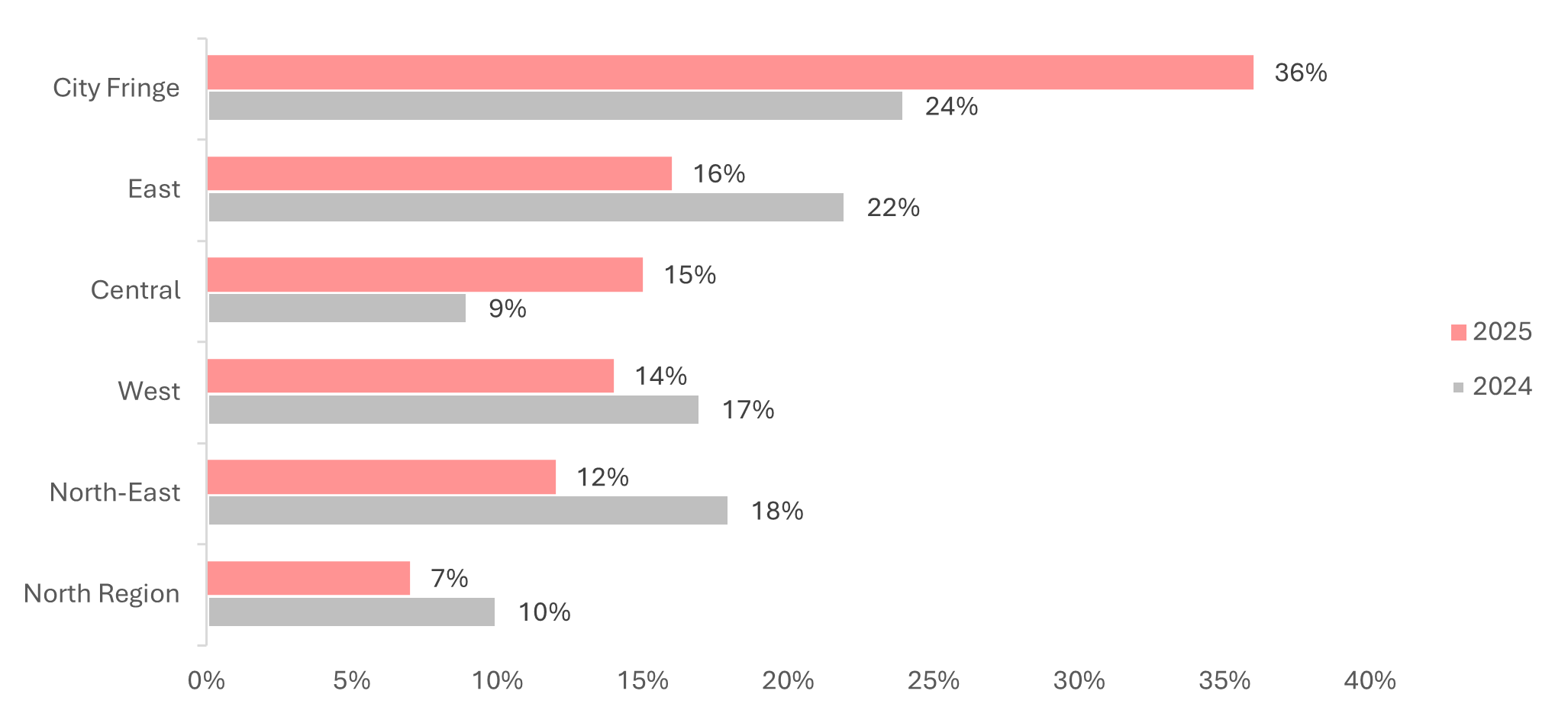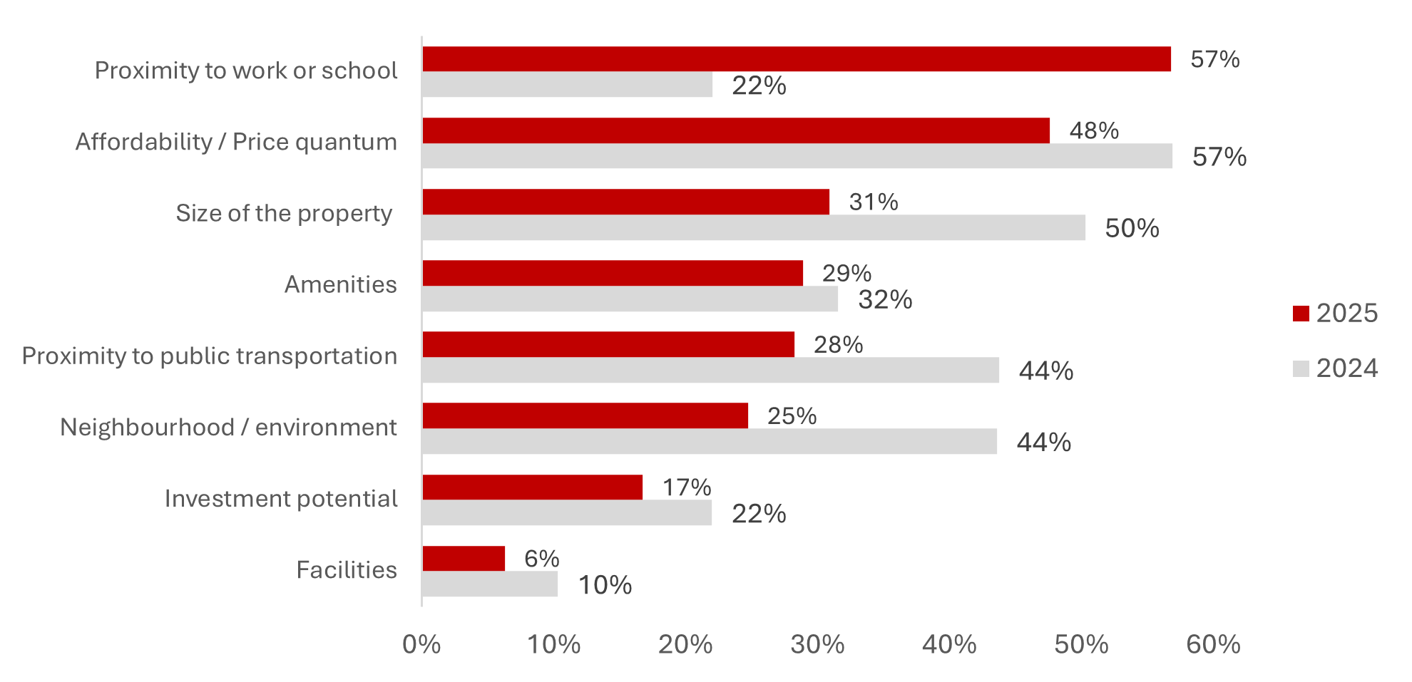 This year, a higher proportion of respondents (36%) indicated a preference for living in the city fringe compared to 2024 (24%). This is followed by the East Region (16%) and the Central Region (15%). This year marked a shift in buying patterns - unlike last year, demand was overwhelmingly skewed towards the Central Region and City Fringe. The trend could be attributed to the narrowing price gap between the RCR and CCR during the first half 2025, prompting buyers to view City Fringe and Central homes as offering better value for money.