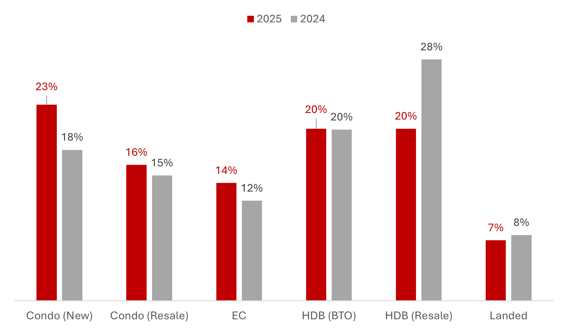 In the landed home segment, the proportion of respondents looking to purchase remained relatively unchanged. Meanwhile, interest in BTO flats continued to hold strong. However, the share of respondents looking to buy a resale HDB flat declined notably – from 28% in 2024 to 20% in 2025 – indicating decreasing demand in the resale market, likely due to concerns around decaying leases.