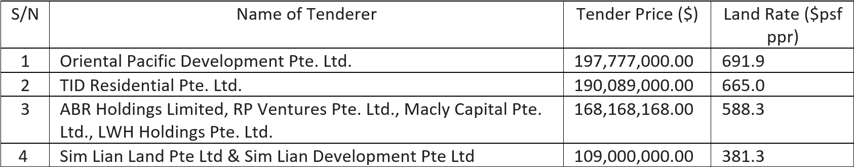 Table 1: Bidders for Sembawang Road EC GLS site