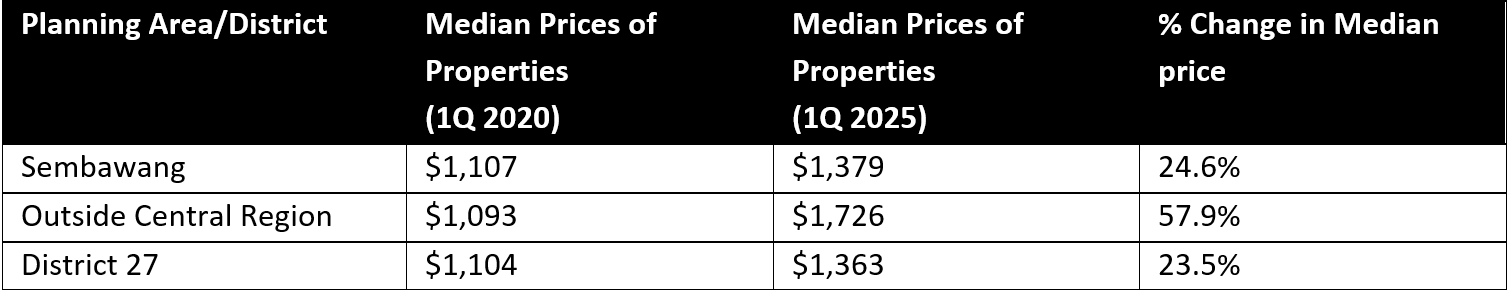 Between 1Q 2020 and 1Q 2025, the median price psf of ECs in Sembawang, District 25, and OCR have increased across the board.