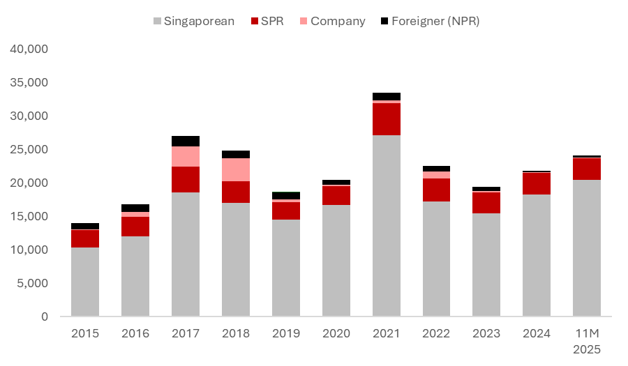 Housing demand from foreigners remained subdued in 2025, largely due to the punitive 60% Additional Buyer’s Stamp Duty. Over 98.6% of residential property transactions were made by Singaporeans and Singapore Permanent Residents (SPR).