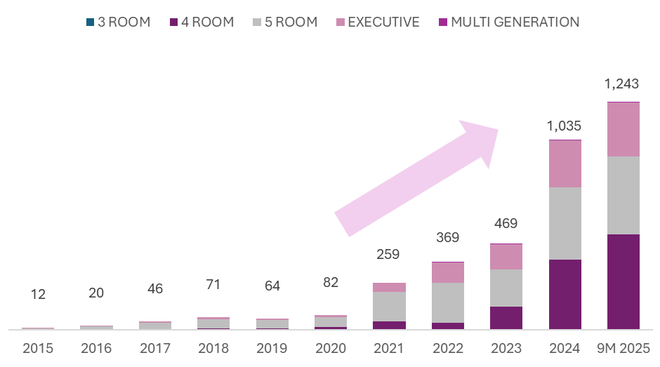 Million-dollar HDB transactions have also hit a new high this year, with 1,243 such deals recorded from January to September 2025. This already surpasses the full-year total of 1,035 million-dollar transactions in 2024. As more of these high-value deals occur, it allows a larger pool of HDB sellers to transition to private property.
