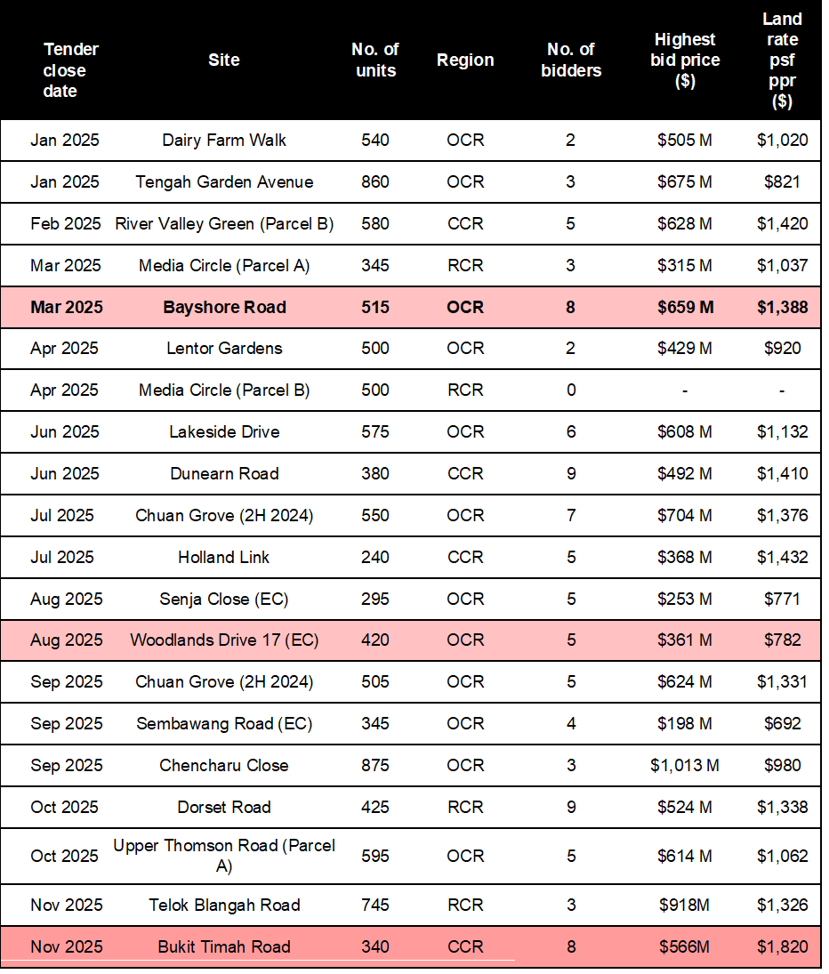 As of 26 Nov 2025, a total of 16 private residential sites and three EC sites have been awarded. However, one site (Media Circle (Parcel B)) received no bids from developers.