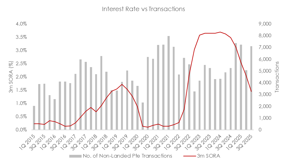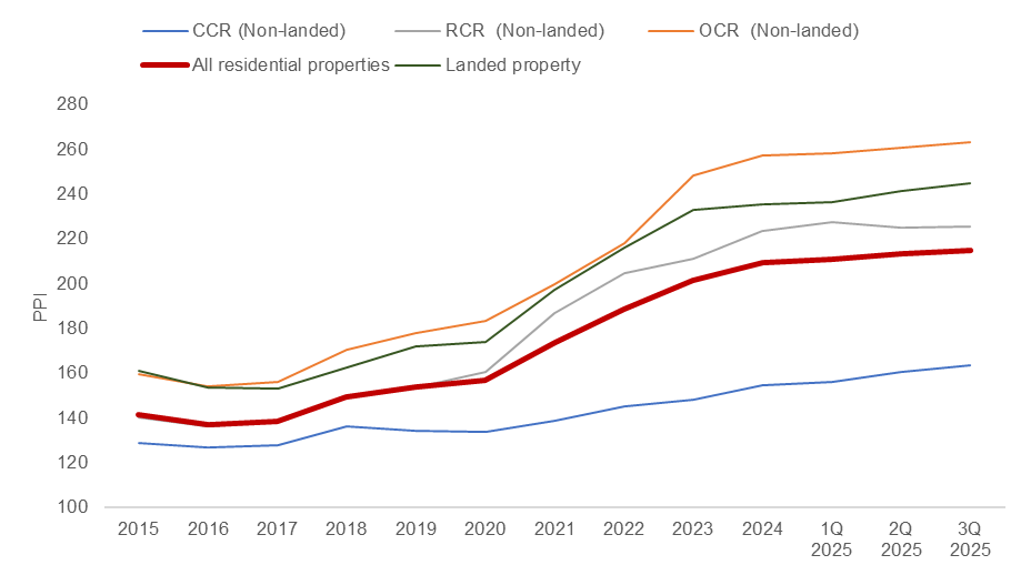 As of 3Q 2025, the non-landed residential price index showed a cumulative 2.5% rise over the three quarters, while the landed homes price index performed more strongly, increasing by 4.0% in the same period.