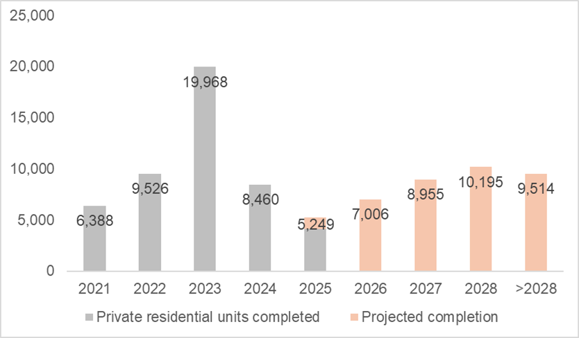 New home completions declined in the second year, dropping approximately 38.0% y-o-y, with only 5,249 units expected to be finished in 2025. This marks a significant decrease since the peak in 2023, when 19,968 units were completed.