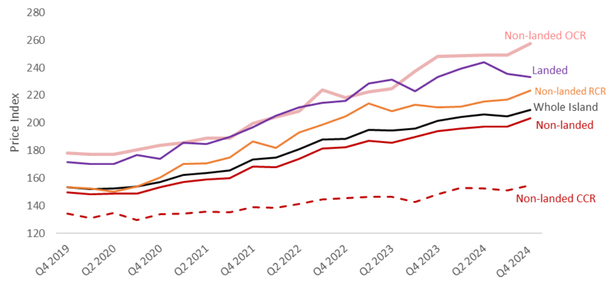 In the non-landed private home segment, prices rose 3.0% q-o-q in 4Q 2024. Notably, this is a more pronounced increase compared to the 0.1% q-o-q gain in non-landed private home prices in 3Q 2024.