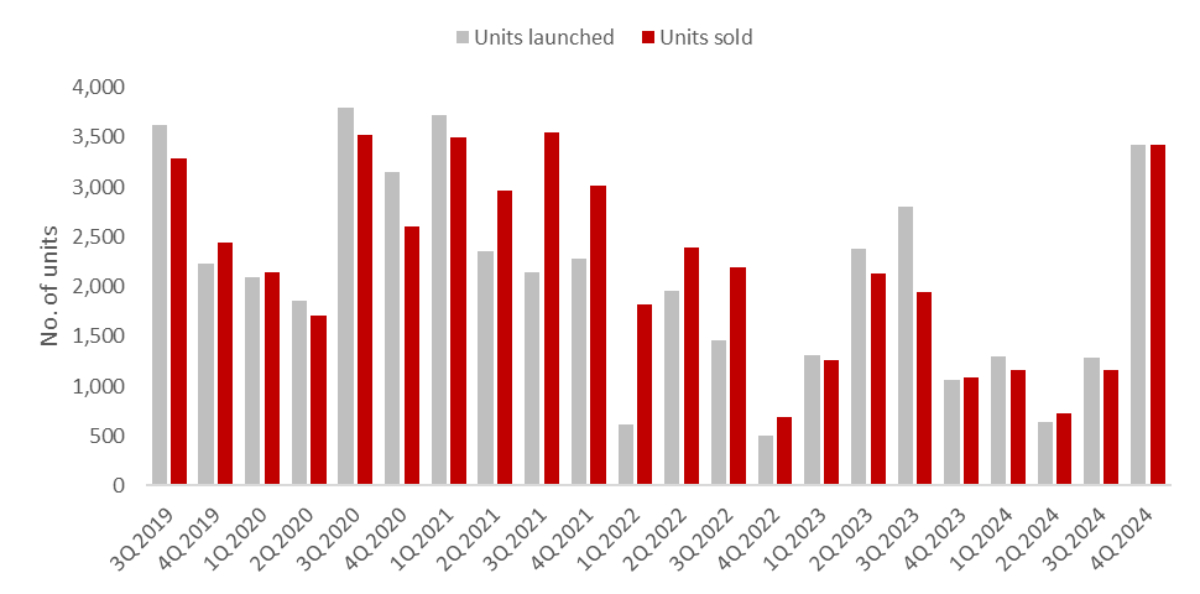 The number of private residential units launched in 4Q 2024 also represents a 166.7% q-o-q increase over the 1,284 units brought to market by developers in 3Q 2024.