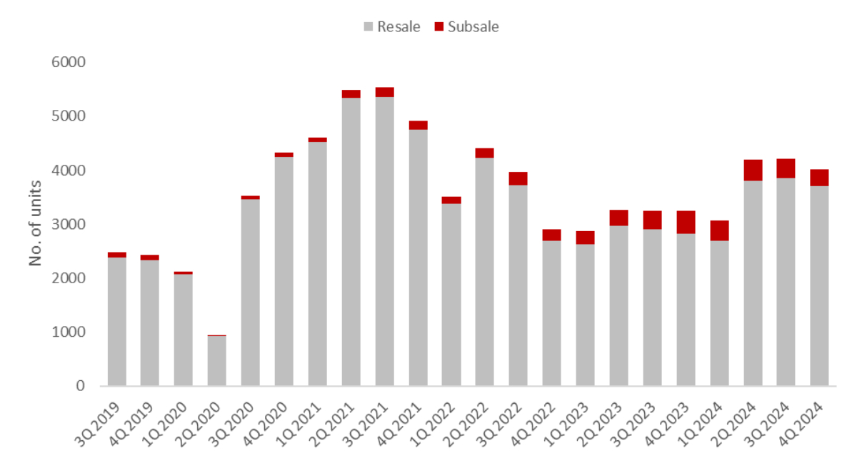 Sub-sales of private homes (excluding ECs) also fell over the quarter. Based on latest data from URA, a total of 311 sub-sale transactions were recorded for 4Q 2024, reflecting 11.6% q-o-q decline from the 352 transactions in 3Q 2024.